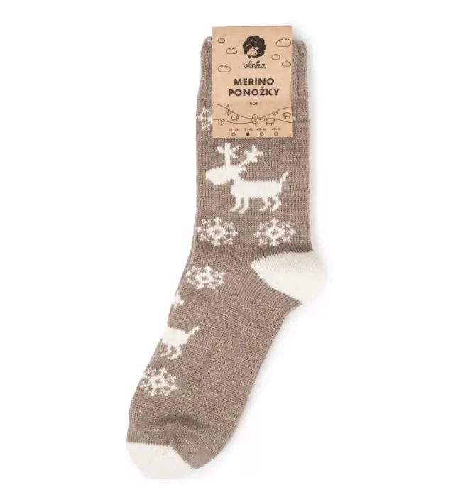 Merino ponožky se sobem a vločkami. Ponožky se sobem a vločkami jsou teplé a měkké. Horní lem ponožek je dostatečně široký, aby nohu nestahoval a ponožky byly pohodlné i na celodenní nošení. Ovčí vlna umí dobře regulovat teplotu a odvádět vlhkost od pokožky. Ponožky jsou vyrobeny z ovčí vlny merino... celý popis