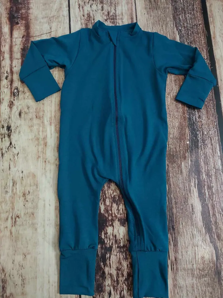 Bambusový overal z naší dílny je krásně jemný a pružný. Zip je protažen až ke spodnímu lemu nohavice pro snadné oblékání.
