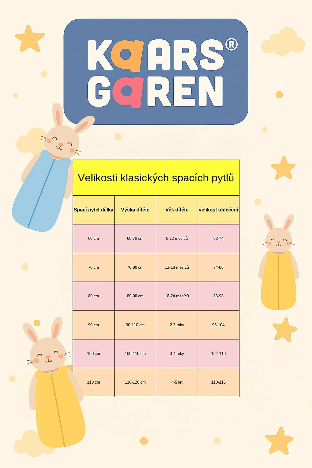 Spací pytle jsou vyráběné v šesti délkách: 70 cm, 80 cm, 90 cm, 100 cm, 110 cm a 130 cm. U dítěte tato délka odpovídá délce od ramínek dolů.