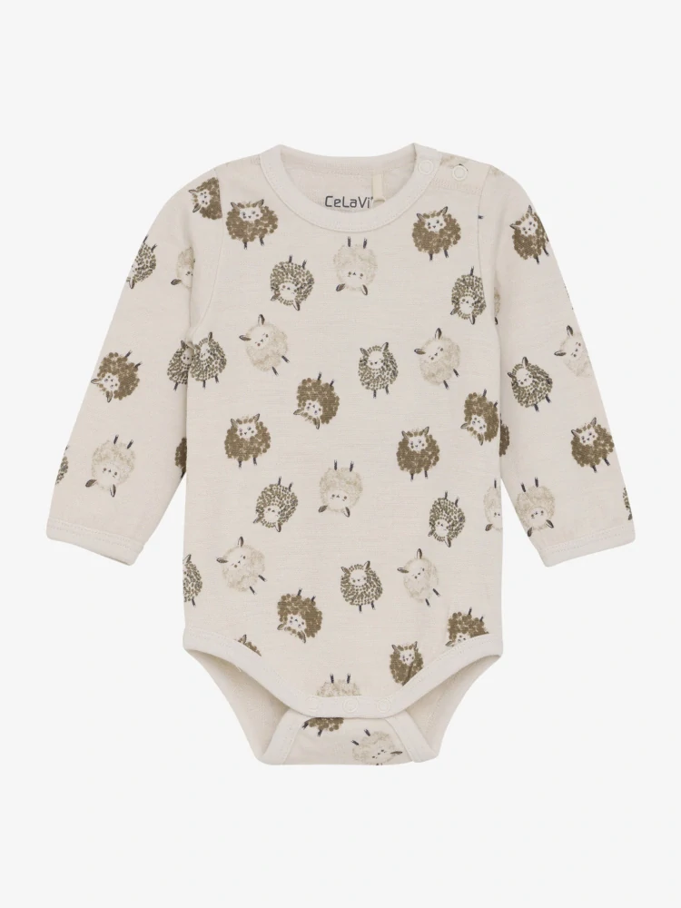Celoroční merino/viskóza body CeLaVi, DR - Celopotisk - Savannah Tan - Ovečky na béžové