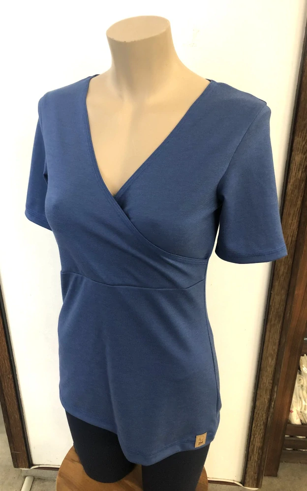 Přední díl tohoto trička je překřížen a ačkoliv není prvotně zamýšleno jako kojící, můžete ho právě tak využít, doporučíme zkombinovat s trojhránkem do výstřihu. Střih je lehce projmutý v pase, díky čemuž tričko krásně sedí, rukávy jsou trochu delší než u našich jiných triček s krátkým rukávem. Využijete ho nejen přes léto, ale jako základní vrstvu po celý rok.