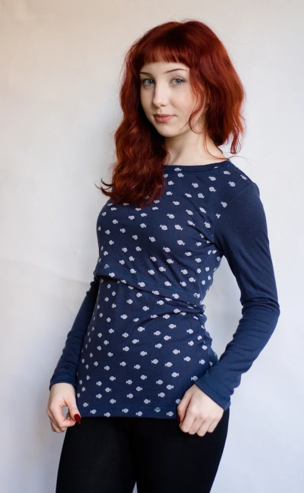 Dámské kojicí zimní merino tričko ZM Basic, dlouhý rukáv - Ryby/tmavě modré rukávy.