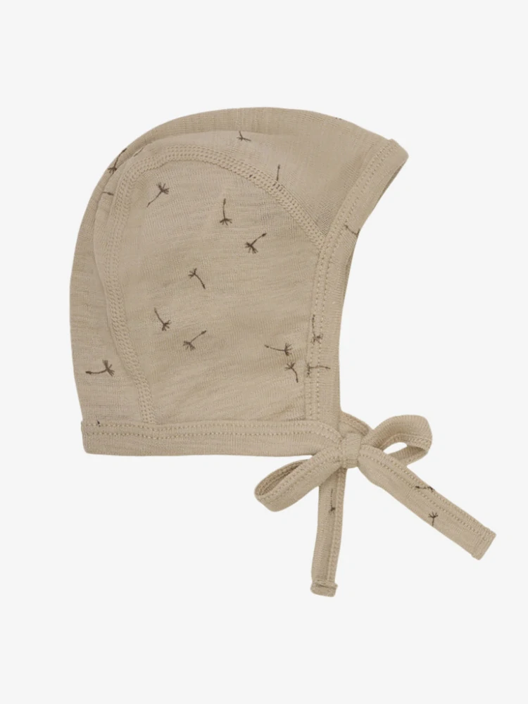 Dětská tenká zavazovací merino/hedvábí čepice FIXONI - Light Taupe.