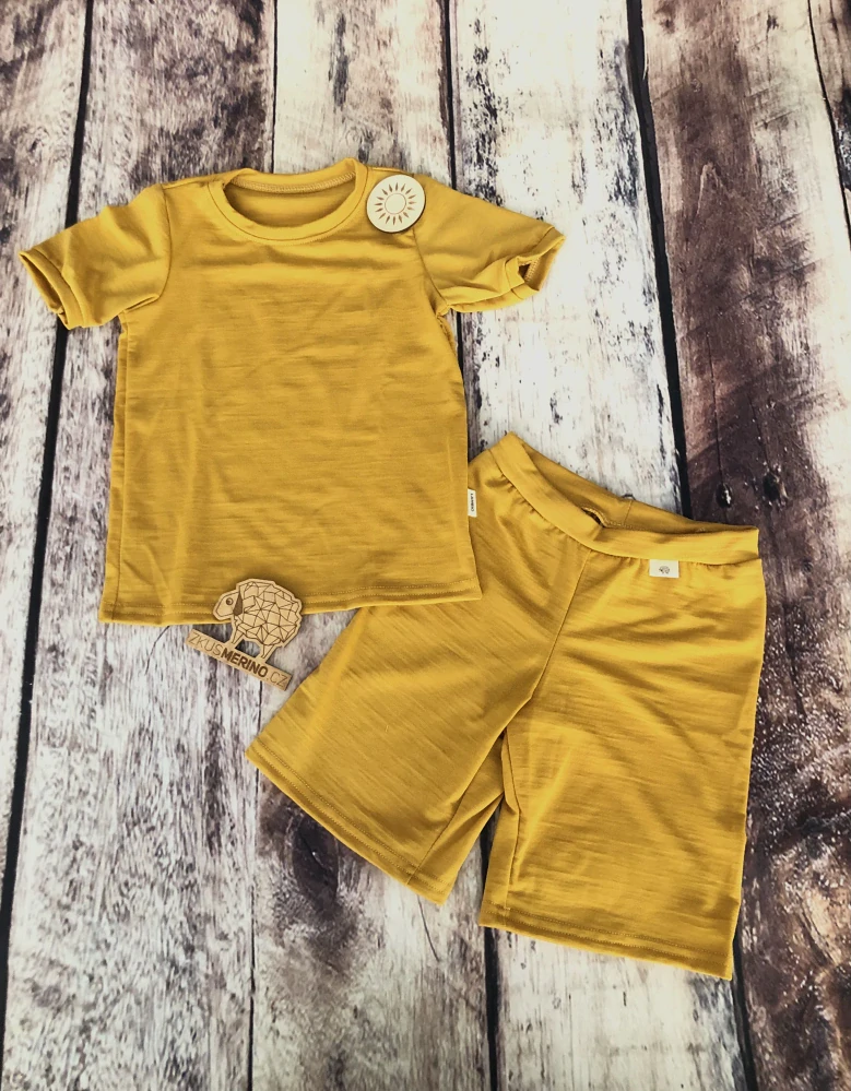 Tento komplet zahrnuje tričko s krátkým rukávem a kraťasy v nádherné barvě. Je ušitý z prvotřídního merino úpletu s příměsí elastanu, který zajišťuje nejen hedvábně jemný dotek, ale také skvělou pružnost a tvarovou stálost. Merino vlna je přirozeně antibakteriální, jemná i k té nejcitlivější pokožce, perfektně odvádí pot od těla a spolehlivě reguluje teplotu. Díky tomu je komplet ideální pro celoroční nošení – v létě chladí, v chladnějších dnech hřeje.
