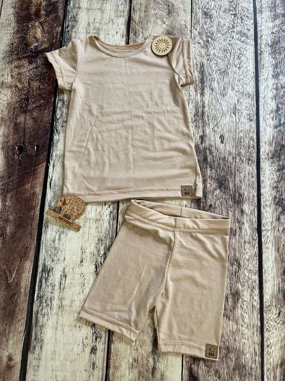 Tento komplet zahrnuje tričko s krátkým rukávem a kraťasy v jemné neutrální barvě. Je ušitý z prvotřídního merino úpletu, který zajišťuje hedvábně jemný dotek. Merino vlna je přirozeně antibakteriální, jemná i k té nejcitlivější pokožce, perfektně odvádí pot od těla a spolehlivě reguluje teplotu. Díky tomu je komplet ideální pro celoroční nošení – v létě chladí, v chladnějších dnech hřeje.