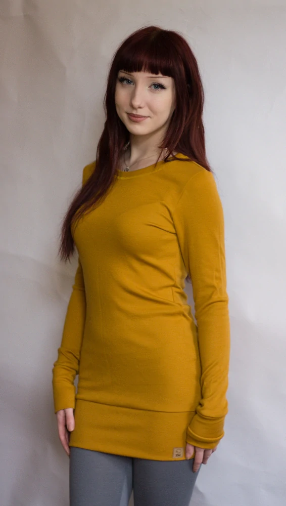 Teplá zimní merino tunika v hořčicové barvě s dlouhým rukávem s náplety je ušitá z kvalitní české metráže, která je samozřejmě vyráběná jako "mulesing free" včetně nejvyšší certifikace Öko-Tex 100.