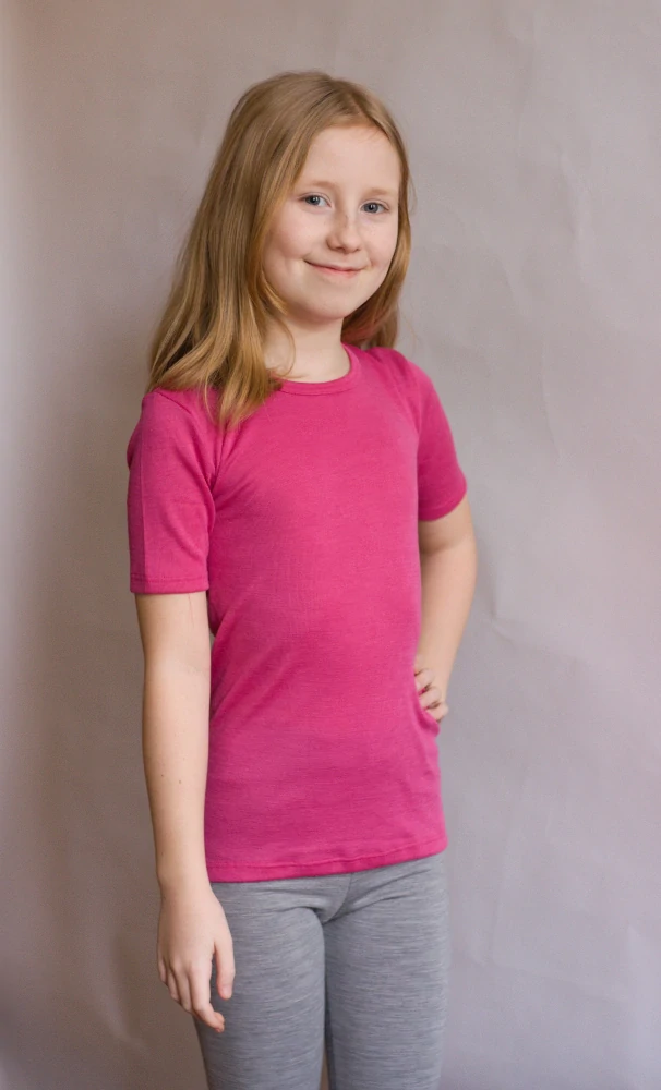 Junior Tričko Engel s krátkým rukávem z merino vlny s hedvábím - Malinové.