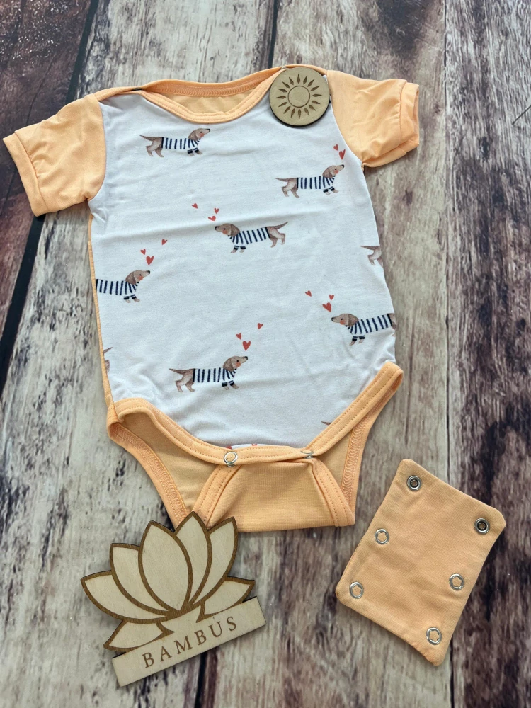 Rostoucí bambusové body Lambio, KR - Jezevčíci/meruňková Tenké letní bambusové body skvělé do teplých letních dnů. Zbrusu nový vylepšený střih s patentkami u krku. Naše letní body se díky tomu dobře obléká, a zároveň nehrozí rozevírání výstřihu. Bodýčko je šité tak, že je vhodné jak pro látk... celý popis