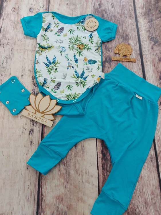 Bambusový komplet - body s krátkým rukávem a harémky - Ptáčci/azur*. Rostoucí letní komplet - body s krátkým rukávem a harémky z úžasně pružného bambusu, který je velmi jemný a na léto velmi lehký. Komplet je skvělý na celodenní nošení především v létě, do šátků a nosítek, ale třeba i do autosedačky... celý popis