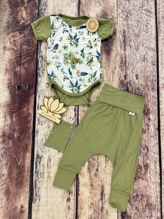 Bambusový komplet - body s krátkým rukávem a harémky - Ptáčci/mechově zelená*.
