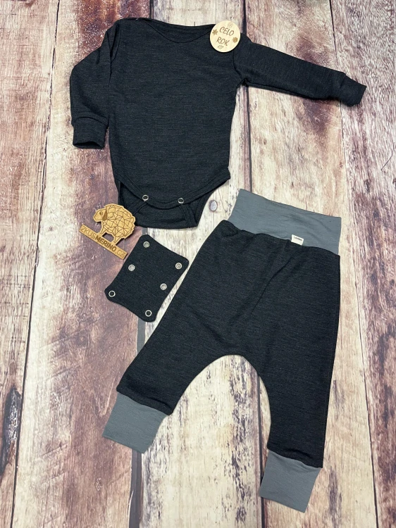 Rostoucí celoroční komplet - body a harémky, z úžasně měkkého a teplého finského merina, které je jemné, vyráběné jako mulesing free a má superwash úpravu.