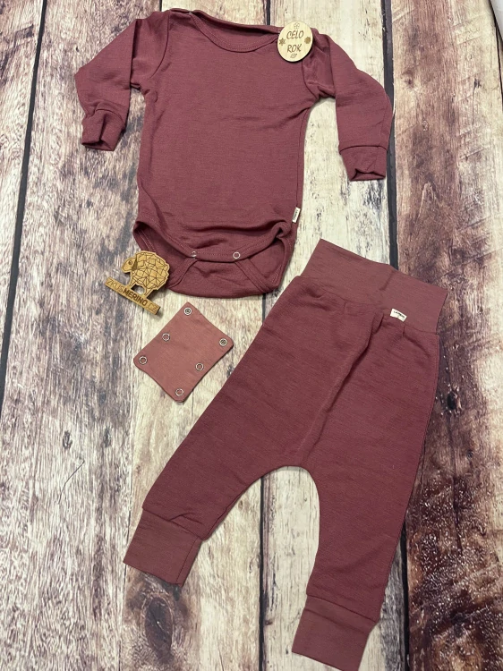 Rostoucí celoroční komplet - body a harémky, z úžasně měkkého a teplého finského merina, které je velmi jemné, vyráběné jako mulesing free a má super wash úpravu.