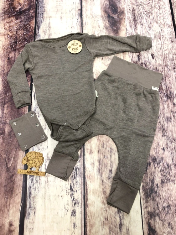 Rostoucí celoroční komplet - body a harémky, z úžasně měkkého a teplého finského light merina, které je velmi jemné, vyráběné jako mulesing free a má super wash úpravu.