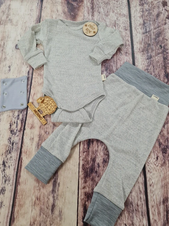 Rostoucí celoroční komplet - body a harémky, z úžasně měkkého a teplého finského merina, které je jemné, vyráběné jako mulesing free a má superwash úpravu.