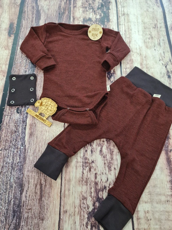 Rostoucí celoroční komplet - body a harémky, z úžasně měkkého a teplého finského merina, které je jemné, vyráběné jako mulesing free a má superwash úpravu.