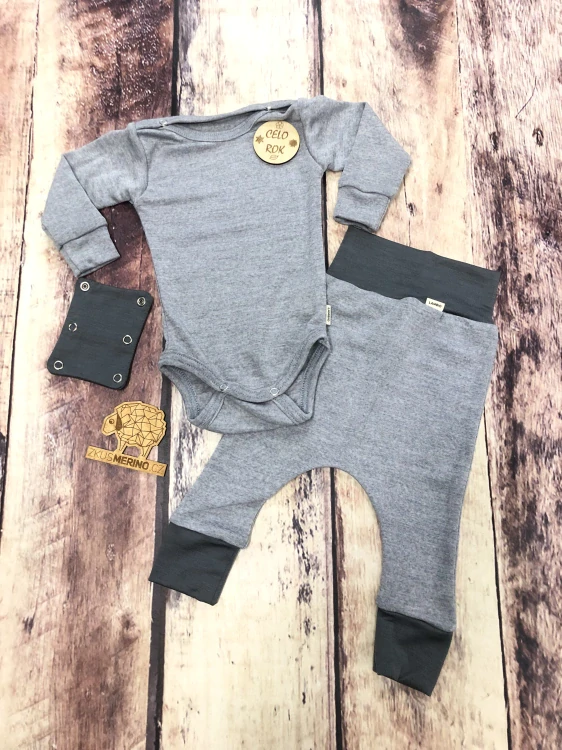 Rostoucí celoroční komplet - body a harémky, z úžasně měkkého a teplého finského light merina, které je velmi jemné, vyráběné jako mulesing free a má super wash úpravu.