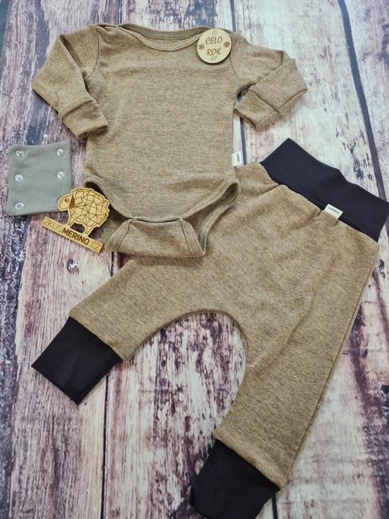 Rostoucí celoroční komplet - body a harémky, z úžasně měkkého a teplého finského merina, které je jemné, vyráběné jako mulesing free a má superwash úpravu.