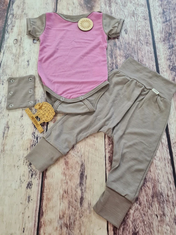 Merino komplet s krátkým rukávem - Pivoňka/oříškový lem* Rostoucí letní komplet - body a harémky, z úžasně tenkého merina, které je velmi jemné, vyráběné jako mulesing free a má super wash úpravu.  Komplet je skvělý na celodenní nošení především v létě, do šátků a nosítek, ale třeba i do autosedačky... celý popis