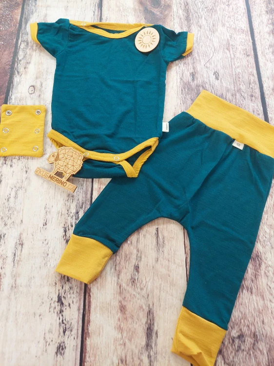 Rostoucí letní komplet - body a harémky, z úžasně tenkého merina, které je velmi jemné, vyráběné jako mulesing free a má super wash úpravu.