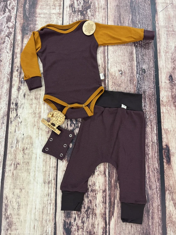 Merino komplet s dlouhým rukávem - Fialový/okr lem.