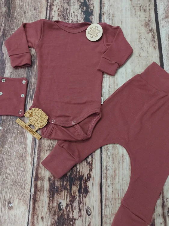 ⚠️ Upozornění: Vzhledem k jemnosti merina nedoporučujeme komplet pro celodenní nošení u aktivně lezoucích miminek, případně jen jako spodní vrtsvu pod odolnější materiál 😉