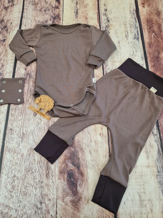 ⚠️ Upozornění: Vzhledem k jemnosti merina nedoporučujeme komplet pro celodenní nošení u aktivně lezoucích miminek, případně jen jako spodní vrtsvu pod odolnější materiál 😉