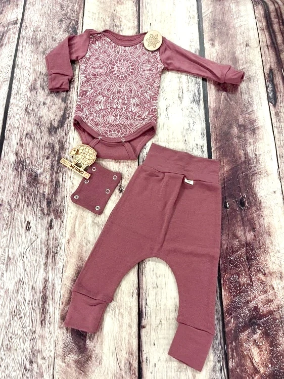 ⚠️ Upozornění: Vzhledem k jemnosti merina nedoporučujeme komplet pro celodenní nošení u aktivně lezoucích miminek, případně jen jako spodní vrtsvu pod odolnější materiál 😉