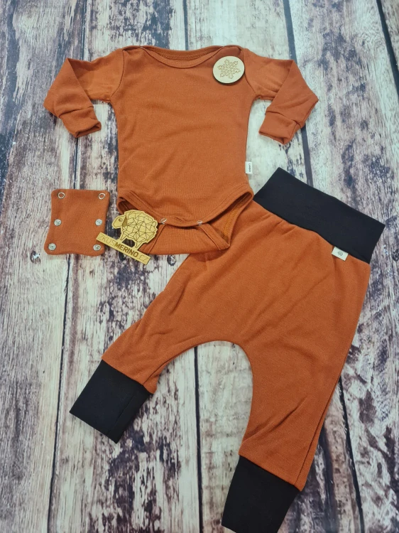 ⚠️ Upozornění: Vzhledem k jemnosti merina nedoporučujeme komplet pro celodenní nošení u aktivně lezoucích miminek, případně jen jako spodní vrtsvu pod odolnější materiál 😉