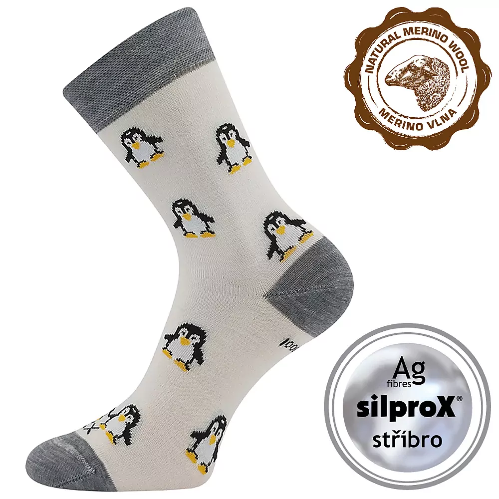 Dámské vlněné merino ponožky VoXX® BUBO s obrázky roztomilých malých soviček. Slabé ponožky jsou i tak teplé a hřejivé díky přírodnímu materiálu vlně merino. Další výhodou je antibakteriální vlastnosti díky materiálu silproX® s ionty stříbra. Jsou odolné proti opotřebení, mají vyztuženou špičku a patu. Ponožky jsou v teplotní třídě B-C.